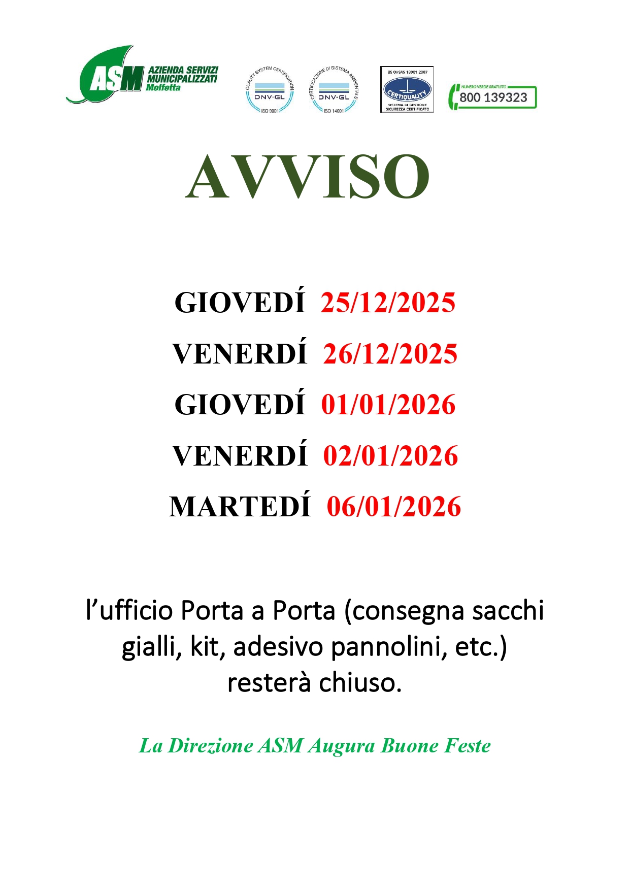 avviso orari ufficio porta a porta periodo natalizio